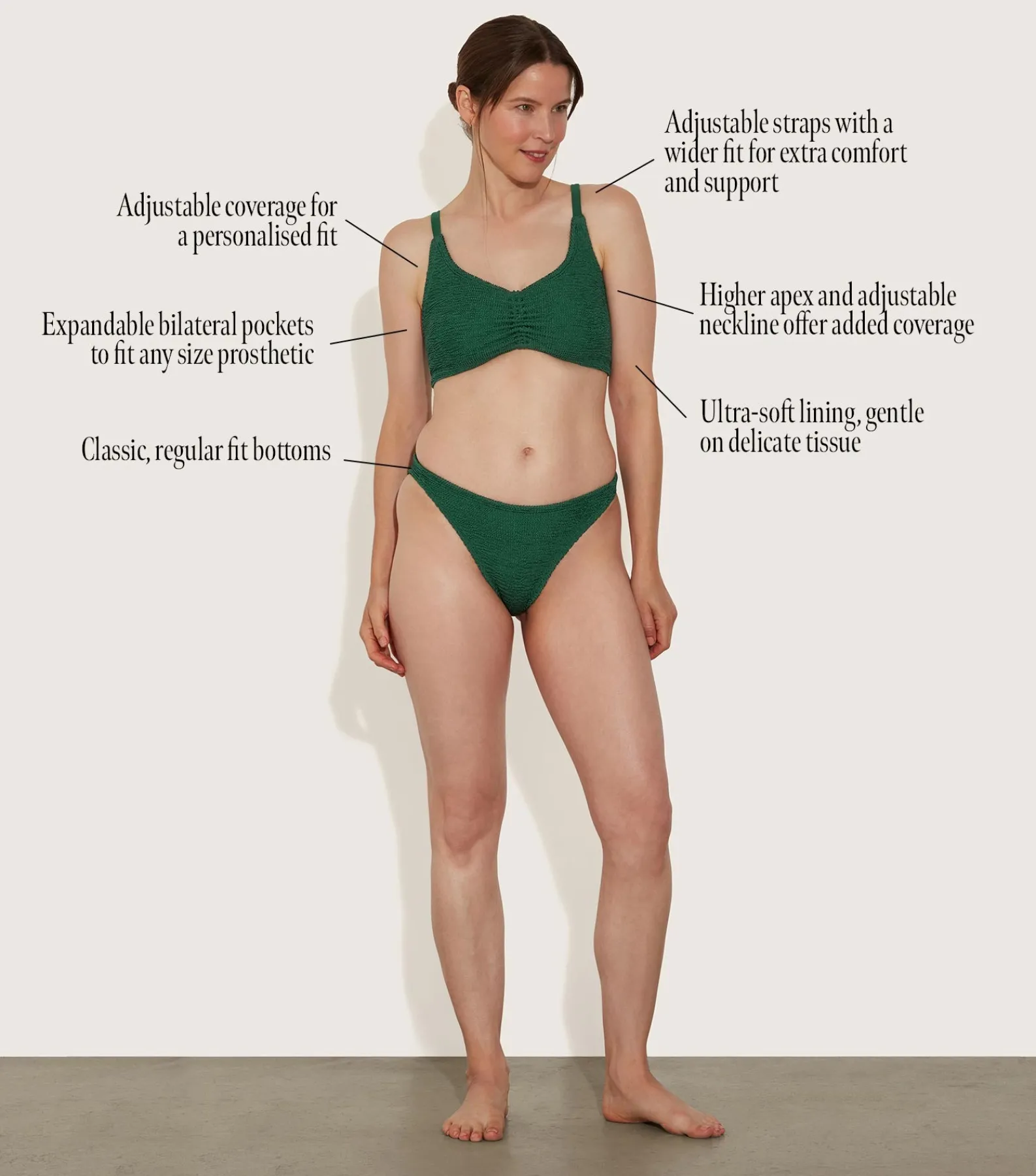 The post-mastectomy bikini features a higher apex on the top and an adjustable centre front for added coverage where desired. Concealed expandable bilateral pockets fit prosthetics of all sizes, while the ultra-soft lining is designed to be gentle against delicate tissue. Wide adjustable straps offer comfort and support. Our signature Original Crinkle™ fabrication and styling, made for every body.